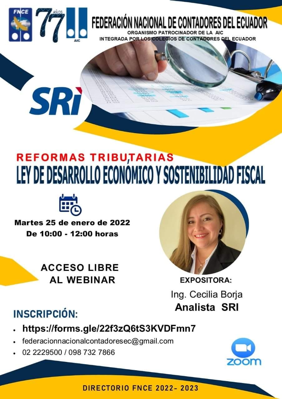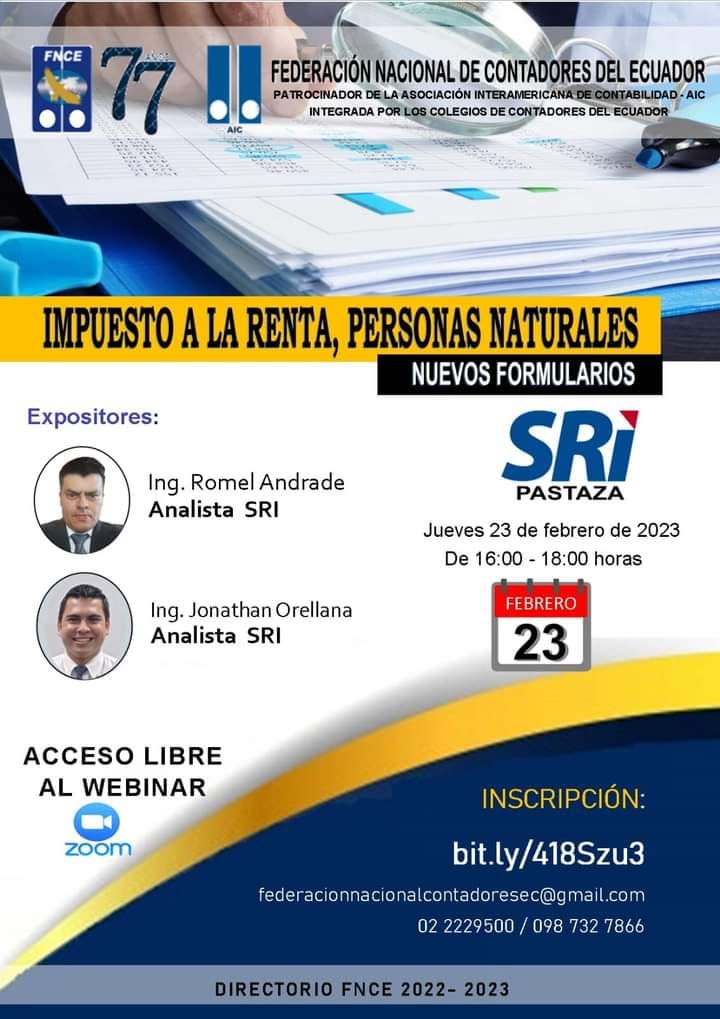Invitamos a la capacitación sobre los nuevos Formularios de Impuesto a la Renta para personas naturales, vigentes para el año fiscal 2022, organizada por la FNCE conjuntamente con el Servicio de Rentas Internas - SRI.